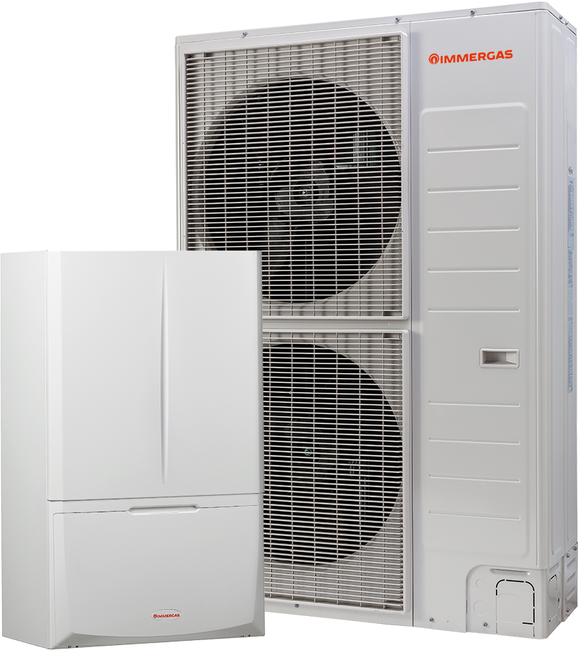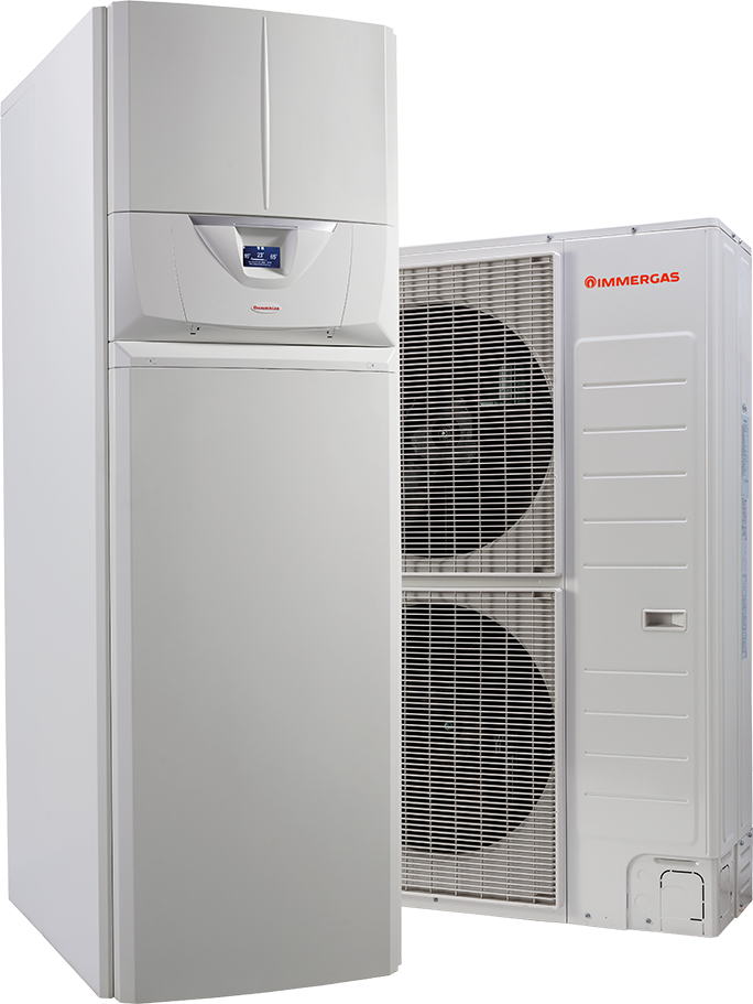 Спліт‑система інверторного реверсивного теплового насоса типу повітря–вода з вбудованими баком‑акумулятором ГВП та обв'язкою для опалення/охолодження підвищеної потужності та трифазним живленням