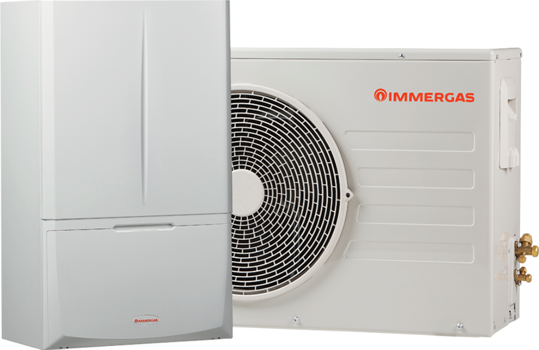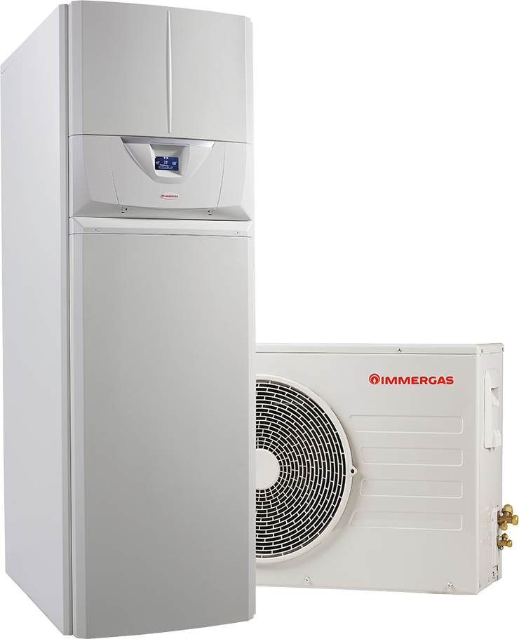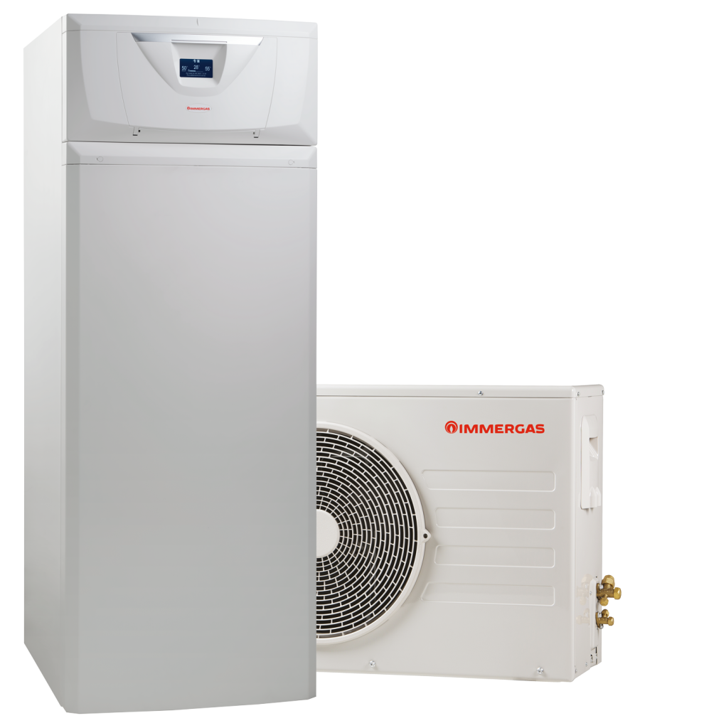 Компактна спліт‑система інверторного реверсивного теплового насоса типу повітря–вода з вбудованими баком‑акумулятором ГВП, обв'язкою для опалення/охолодження та інтеграційним догрівачем опалення