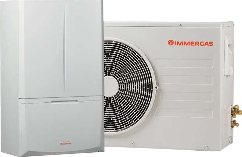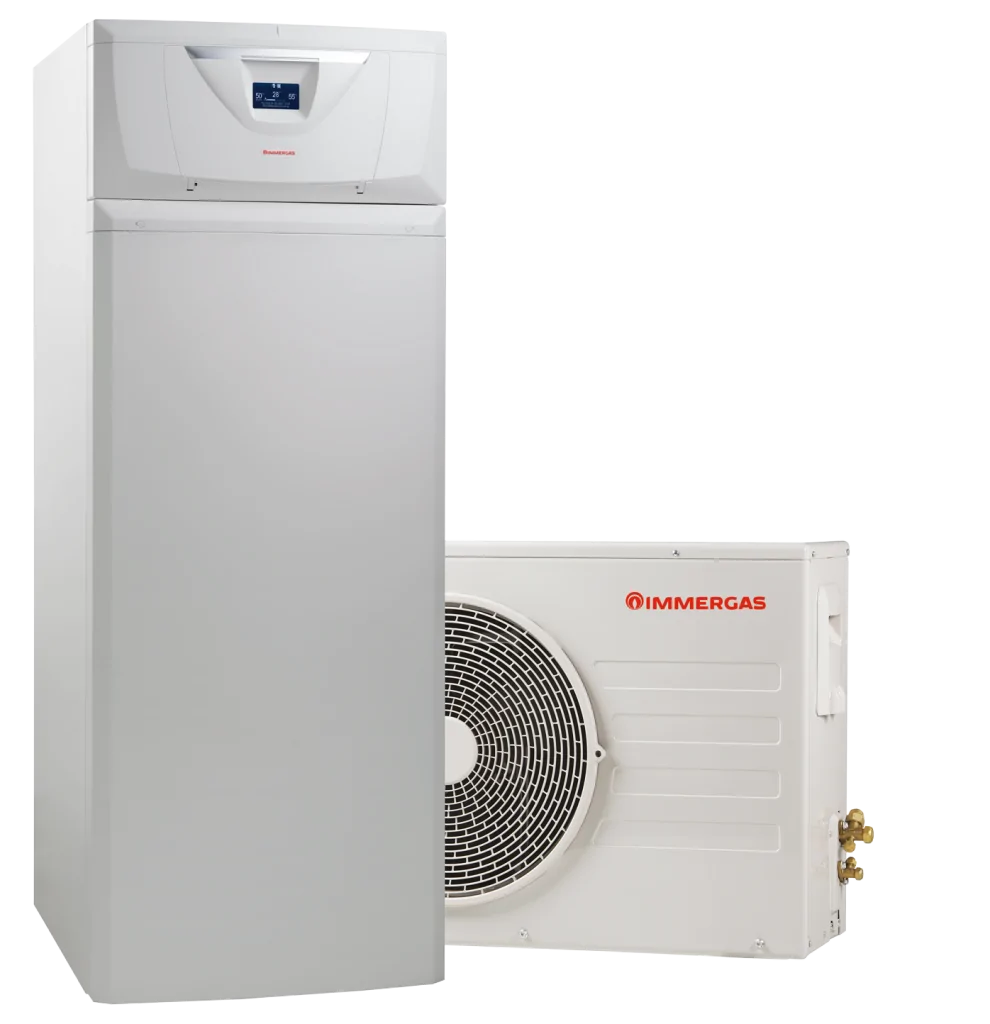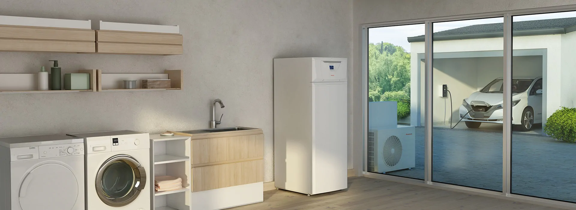 Компактна спліт‑система інверторного реверсивного теплового насоса типу повітря–вода з вбудованими баком‑акумулятором ГВП, обв'язкою для опалення/охолодження та інтеграційним догрівачем опалення