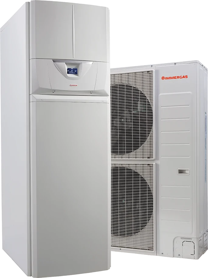 Спліт‑система інверторного реверсивного теплового насоса типу повітря–вода з вбудованими баком‑акумулятором ГВП та обв'язкою для опалення/охолодження підвищеної потужності та трифазним живленням